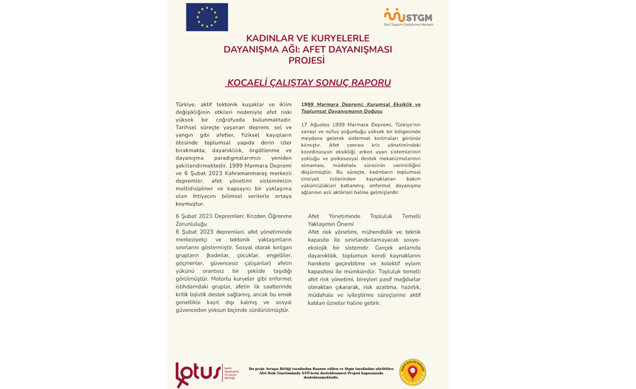 Avrupa Birliği tarafından finanse edilen ve STGM tarafından yürütülen Afet Risk Yönetiminde STÖ’lerin Kapasitesinin Desteklenmesi Projesi kapsamında gerçekleştirilen Kocaeli Afet Dayanışması Çalıştayı, kadın örgütleri, kuryeler, akademisyenler, yerel yönetimler ve meslek örgütlerini bir araya getirdi. Toplumsal cinsiyete duyarlı afet politikaları, psikososyal destek ihtiyacı, afet lojistiğinde kuryelerin görünmeyen rolü, yerel yönetimlerin kapasite eksiklikleri ve sivil toplum dayanışma ağlarının güçlendirilmesi çalıştayın öne çıkan başlıkları arasında yer aldı. Rapor, teknik kapasite kadar dayanışma ve katılımcılık temelli yaklaşımların önemini ortaya koyarak; toplumsal cinsiyete duyarlı dönüşüm, yerelleşmiş koordinasyon mekanizmaları, psikososyal direncin güçlendirilmesi, veriye dayalı ve kapsayıcı afet lojistiği ile sivil toplumun kurumsallaşmasının afet yönetiminin ayrılmaz bir parçası olduğunu vurguluyor. Türkiye’nin daha dayanıklı ve kapsayıcı bir afet yönetim sistemine ihtiyaç duyduğunu gösteren bu çalışma, proje kapsamında önemli bir kilometre taşı niteliği taşıyor.